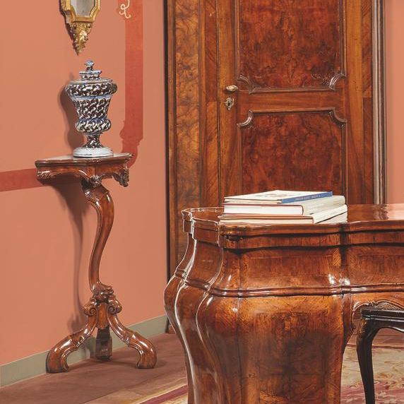 COPPIA DI GUERIDONS, VENEZIA, METÀ SECOLO XVIII in legno di noce intagliato, piano sagomato sotteso da fascia decorata a motivi rocaille scende in stelo a voluta terminante in motivo a zampa ferina e sfera, poggiante a sua volta su base a tripode; cm 81x32,5x45,5 A PAIR OF VENETIAN GUERIDONS, HALF 18TH CENTURY