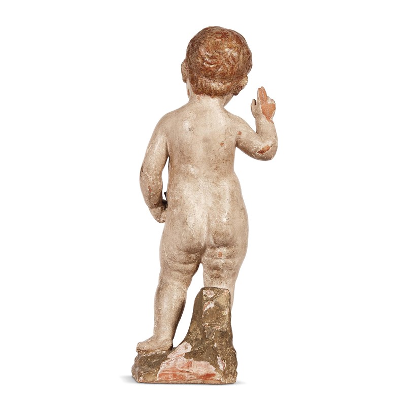 in terracotta policroma, il Bambino raffigurato stante, la mano destra benedicente, la sinistra sul fianco stringe al corpo quella che probabilmente era l'asta della croce. La riproduzione di una scultura analoga è presente nella Fototeca Zeri (n. 73242) con attribuzione ad artista anonimo della seconda metà del XV secolo, derivata dal Gesù Bambino benedicente di Desiderio da Settignano databile intorno al 1460 conservata nella Basilica di San Lorenzo a Firenze, che fu oggetto di una viva devozione, e pertanto replicato in una quantità innumerevole di esemplari, in marmo (Baccio da Montelupo, Francesco di Simone Ferrucci e altri), in legno, in terracotta dipinta e invetriata, e soprattutto in stucco. Questa versione si distingue dal prototipo desideriesco, come pure dalle sue repliche, per alcune varianti, come la diversa inclinazione della testa e la postura della mano sinistra, che sostiene una canna invece della consueta corona di spine con i chiodi, e può far pensare a Baccio da Montelupo, autore della replica marmorea oggi al Louvre, già anch'essa in San Lorenzo; cm 50,5x20x15