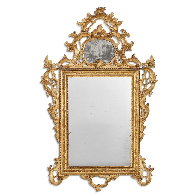 GRANDE SPECCHIERA, VENEZIA, SECOLO XVIII in legno intagliato e dorato, grande cimasa aggettante con specchio di forma esagonale riccamente decorata presenta ornamento a rocaille a giorno che discende sui fianchi e termina con pendaglina ed elementi analogamente lavorati ai lati in basso; cm 226x134