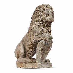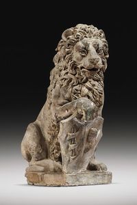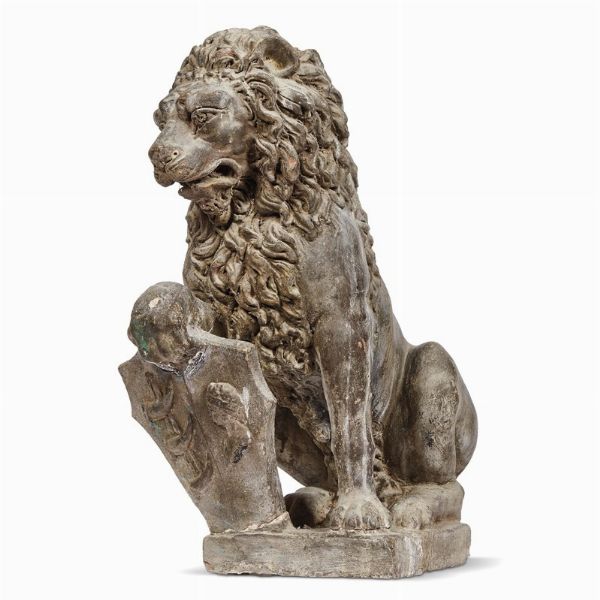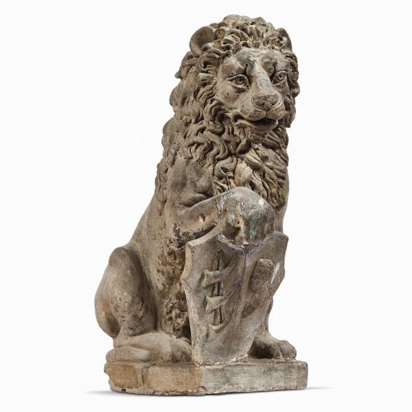 in terracotta, il leone rirpoduce la tipologia del Marzocco recante stemma sotto la zampa destra; cm 56x43x28
