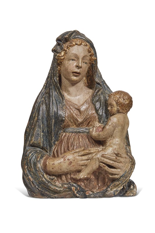 Interessante e rara terracotta fiorentina avvicinabile ai modi di scultori attivi nei primi decenni del Quattrocento, quali Michele da Firenze (Firenze, 1385 – 1455 circa) e Nanni di Bartolo (attività documentata tra il 1419 e il 1437) che in molte occasioni si trovarono a condividere la geografia delle commissioni. I confronti più stringenti si possono effettuare con alcune Madonna ricondotte, se pur con qualche incertezza, agli esordi di Nanni: lo spiccato turgore delle carni, le mani grandi e forti della Vergine e la morbida consistenza delle ciocche della sua mossa capigliatura sono caratteristiche di sue opere giovanili che dialogano con le superbe prove donatelliane sul tema, quali il gruppo della National Gallery di Washington. Si vedano la cosiddetta Madonna tra le fronde già a Berlino, Kaiser Friedrich Museum, o quella in collezione privata precedentemente appartenente a P. Corsini a New York (Fototeca Zeri, scheda 73108; cfr. Markham Schulz A., Nanni di Bartolo e il portale di San Nicola a Tolentino, 1997, pp. 94-96).