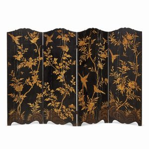 PICCOLO PARAVENTO, PIEMONTE, SECOLO XVIII in legno laccato nero e oro, raffigurante uccelli e piante con melograni; [..]