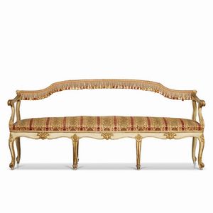 COPPIA DI DIVANI DA INGRESSO, ITALIA SETTENTRIONALE, SECOLO XVIII in legno intagliato e dorato e laccato color [..]