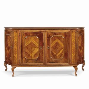 CREDENZA, VENETO, METÀ SECOLO XVIII impiallacciata in radica, il fronte dritto presenta ante decorate con [..]