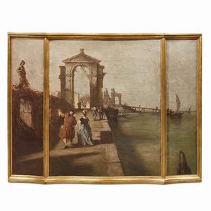 PARACAMINO, INIZIO SECOLO XX a tre ante dipinte su tela con veduta veneziana in stile di Francesco Guardi, cm [..]