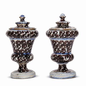 COPPIA DI VASI CON COPERCHIO, ITALIA CENTRALE, INIZI SECOLO XVIII in terraglia policroma, corpo a balaustro su [..]