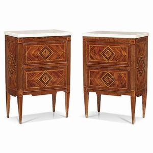 COPPIA DI MOBILETTI, NAPOLI, SECONDA METÀ SECOLO XVIII in legno lastronato, il piano in marmo bianco sotteso [..]