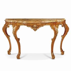 CONSOLE, VENEZIA, METÀ SECOLO XVIII in legno intagliato e dorato, il piano in marmo bianco di linea mossa [..]
