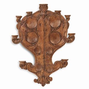 COPPIA DI PANNELLI PORTA-PORCELLANE, VENEZIA, SECOLO XVIII in noce intagliato, presentano sul fontre otto tondi [..]