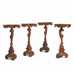 QUATTRO GUERIDON IN STILE VENEZIANO DEL XVIII SECOLO in noce intagliato, piano di linea sagomata sotteso da fascia [..]