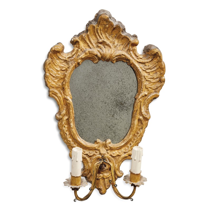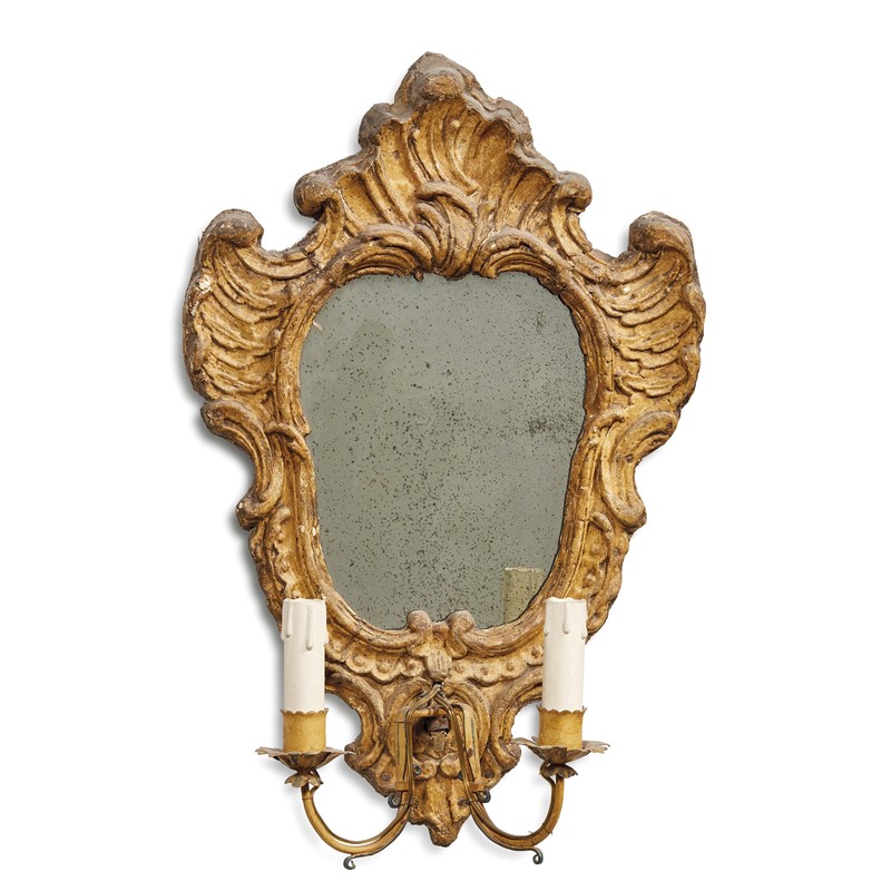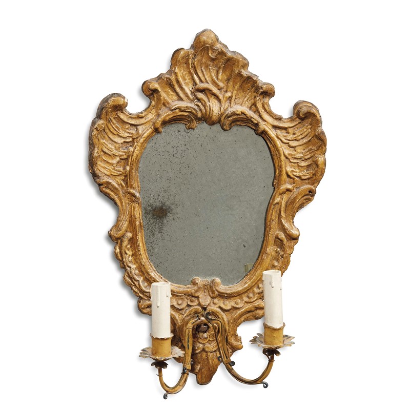 NOVE VENTOLE, PIEMONTE, METÀ SECOLO XVIII in legno rivestito in papier maché dorata, di forma a cartouche con specchio, sotto al quale si dipartono due bracci; montate ad elettricità; cm 59x34x14,5