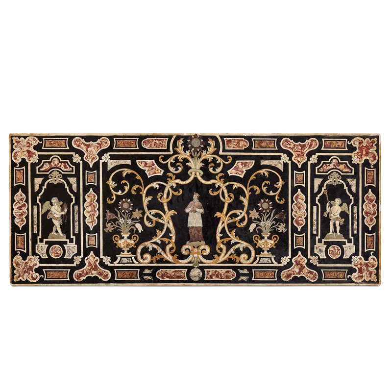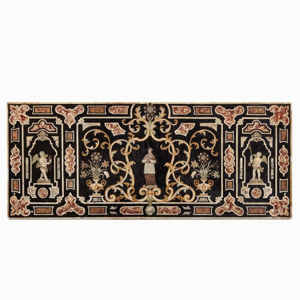 in scagliola policroma; il paliotto è tripartito secondo un ordinato schema geometrico alternato a formelle mistilinee policrome a finto marmo ed ospita tre eleganti figure definite a tratteggio nero: due angeli laterali e speculari su piedistalli che reggono mitria e pastorale e al centro un santo che probabilmente è in procinto di ricevere l'investitura. Il vescovo è racchiuso entro i consueti girali fitomorfi, affiancati da vasi di fiori variopinti presenti ai lati e al centro della fascia superiore; cm 75x186