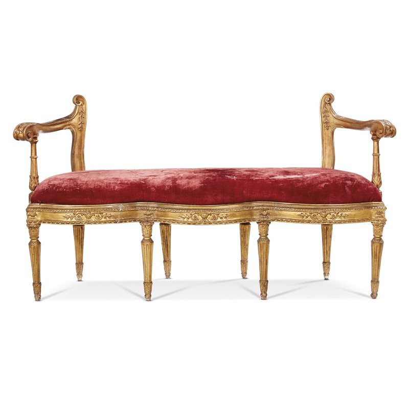 in legno intagliato e dorato, seduta di velluto rosso, braccioli a voluta su sostegni a colonna, cintura a serpentina poggiante su otto gambe scanalate e rastremate; cm 84x157x54,5