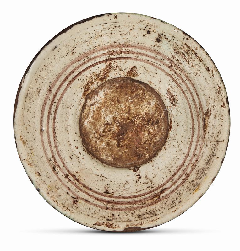 PIATTO, MONTELUPO, 1620-1640 CIRCA in maiolica dipinta in policromia, forma piana leggermente concava con orlo arrotondato e piede ad anello appena rilevato. La superficie è interamente ricoperta dalla decorazione policroma, mentre sul retro il piatto mostra tre linee concentriche in manganese. Al centro della composizione un personaggio maschile con un bastone nella mano sinistra; sullo sfondo il classico paesaggio con due picchi appiattiti posti alle estremità e le fronde di due alberi ai lati; diam. cm 24