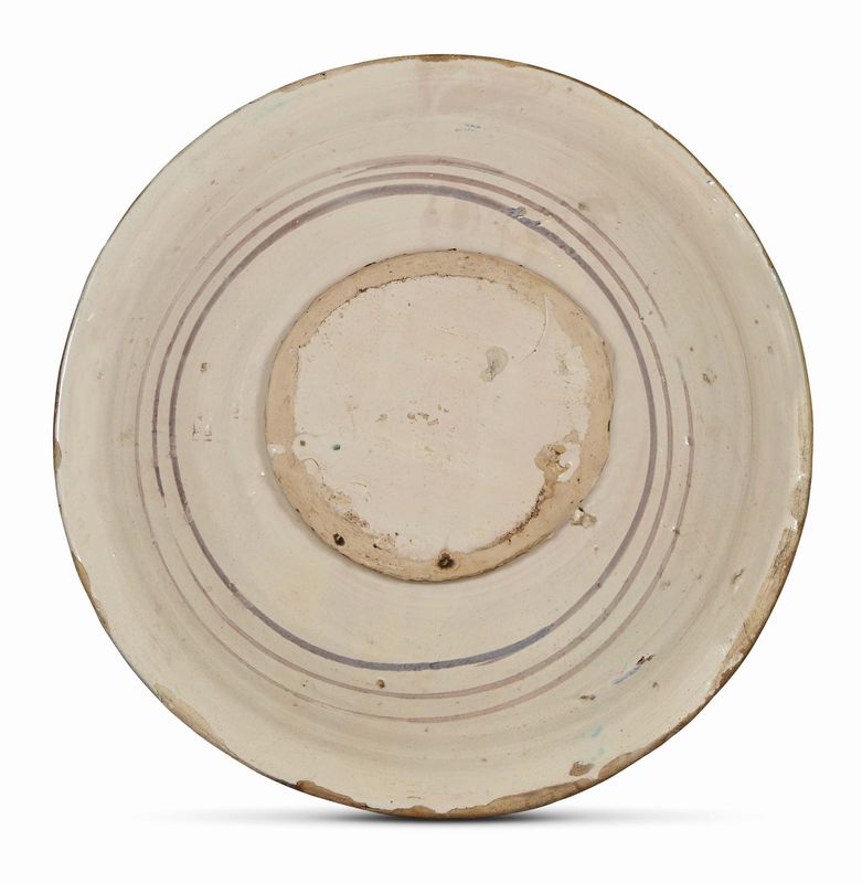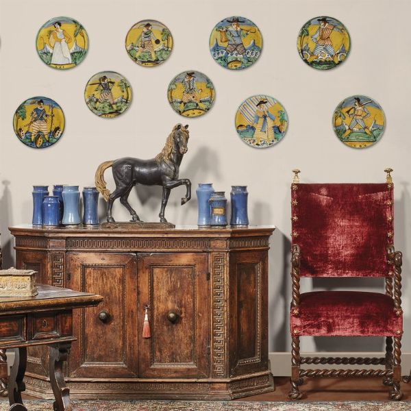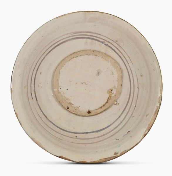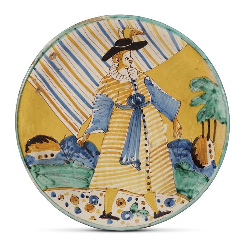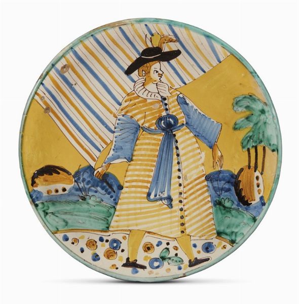 PIATTO, MONTELUPO, 1650 CIRCA in maiolica dipinta in policromia, forma piana leggermente concava con orlo arrotondato e piede ad anello appena rilevato. La superficie è interamente ricoperta dalla decorazione policroma, mentre sul retro il piatto mostra tre linee concentriche in manganese. Al centro della composizione uno sbandieratore avanza verso la sua sinistra tenendo nella mano destra un grande vessillo; sullo sfondo il classico paesaggio con due picchi arrotondati posti ai suoi lati e un alberello sulla destra; diam. cm 32,2
