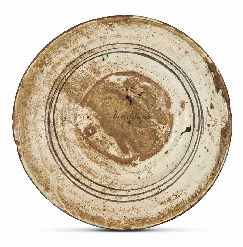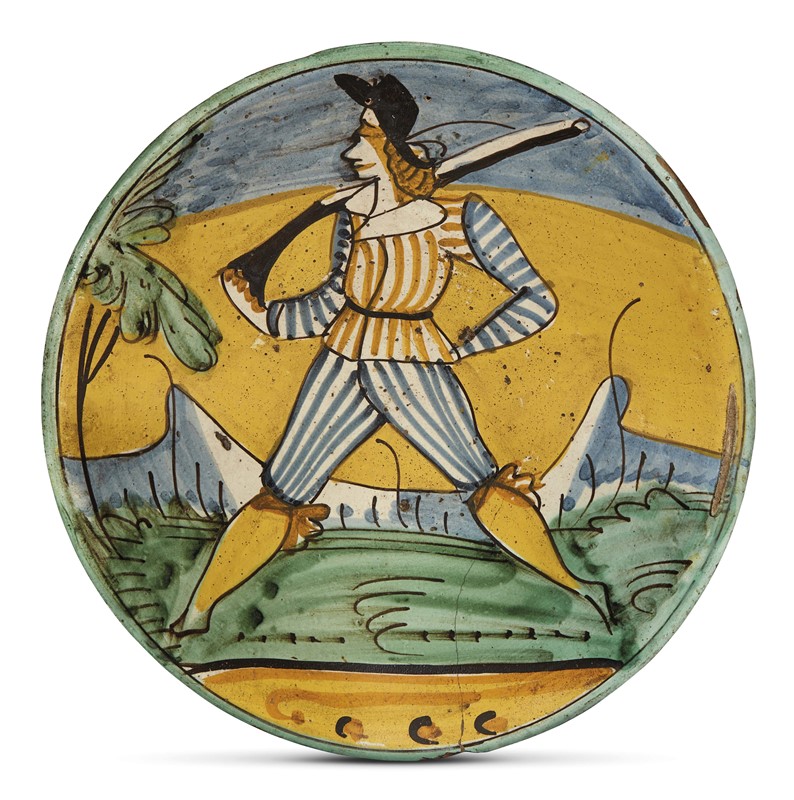 PIATTO, MONTELUPO, 1650 CIRCA in maiolica dipinta in policromia, forma piana leggermente concava con orlo arrotondato e piede ad anello appena rilevato. La superficie è interamente ricoperta dalla decorazione policroma, mentre sul retro il piatto mostra tre linee concentriche in manganese. Al centro della composizione un archibugiere avanza verso la sua destra portando l’arma sulla spalla; sullo sfondo il classico paesaggio con due picchi appuntiti posti ai suoi lati e le fronde di un albero sulla sinistra. Sul retro la scritta Montelupo in inchiostro bruno; diam. cm 32,5