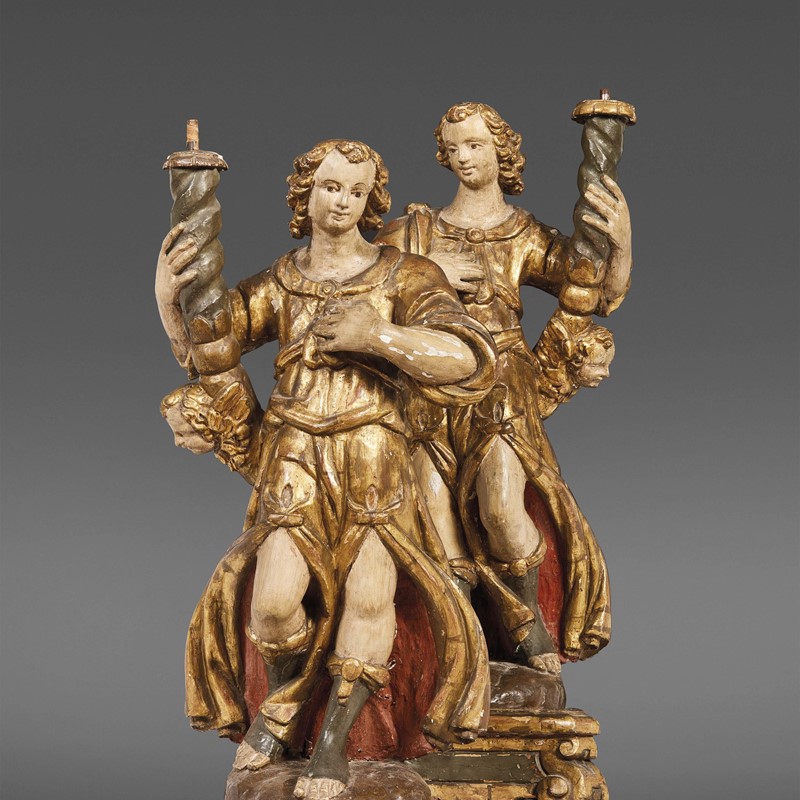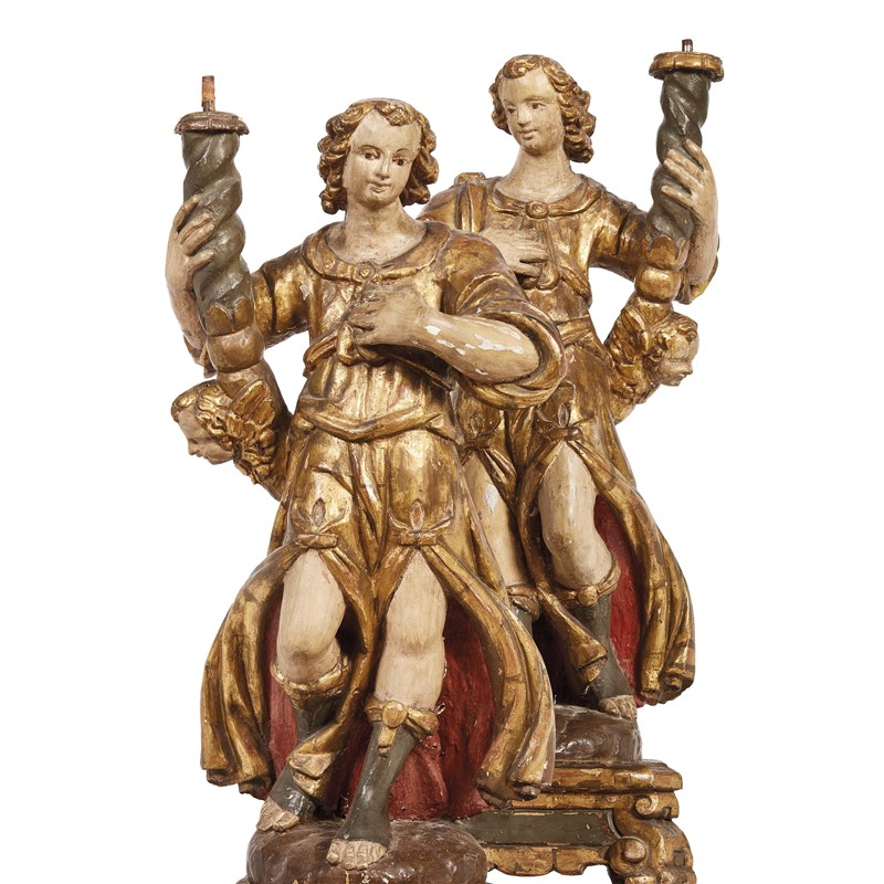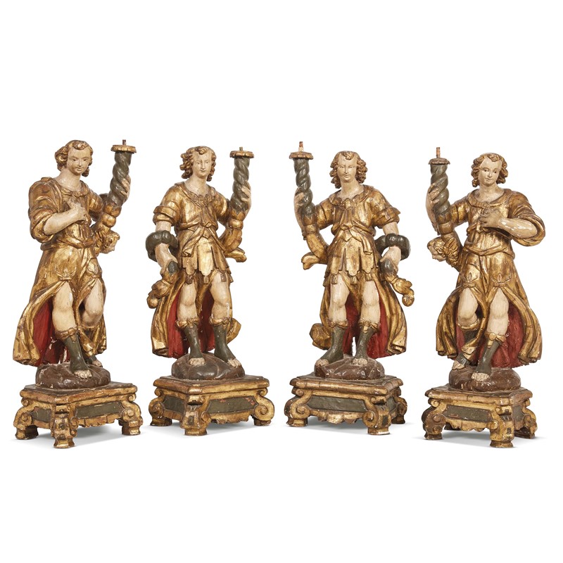 QUATTRO ANGELI REGGICERO, ITALIA CENTRALE, SECOLO XVI in legno intagliato, laccato e dorato, raffiguranti stanti e ricoperti di un elegante veste, una mano a reggere la torcera scolpita a torciglione; montati su basi quadrangolari poggianti su piedi a voluta posti agli angoli; cm 80x35x22