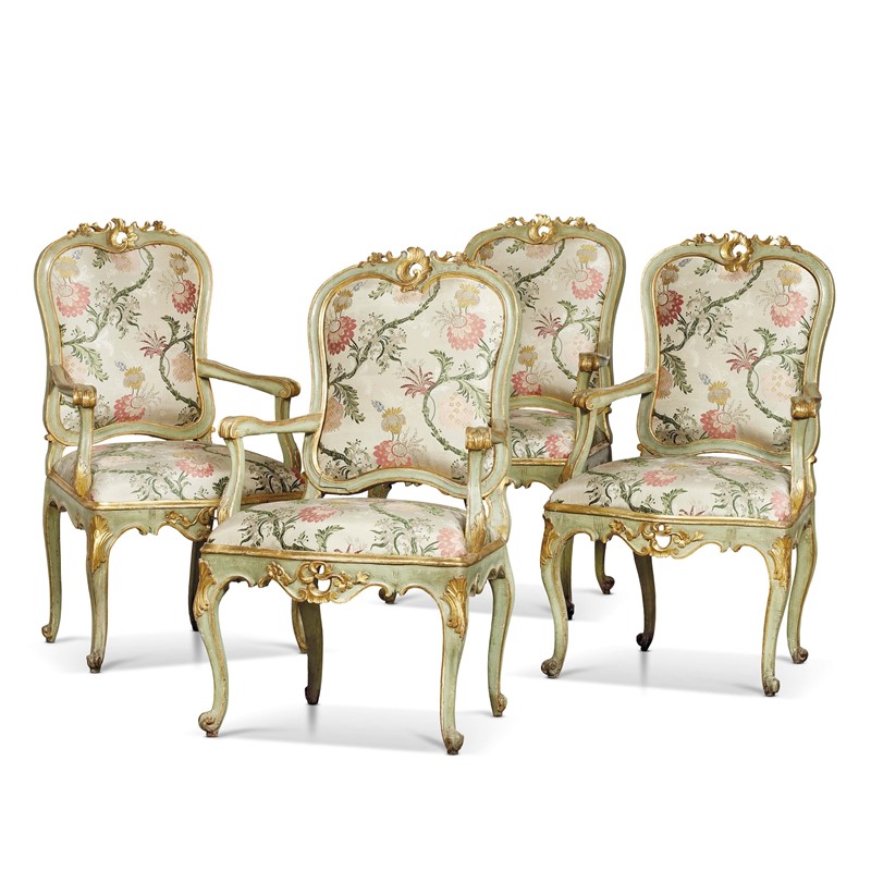 QUATTRO POLTRONE, ITALIA CENTRALE, SECOLO XVIII in legno laccato e dorato, di colore verde con profilature dorate, con schienale e seduta rivestiti in stoffa con decori floreali. La spalliera si sviluppa in decoro rocaille e fiorellini, lo schienale di linea mossa prosegue su braccioli terminanti a voluta e impreziositi da elemento floreale; la pendaglina di linea mossa presenta decoro rocaille e gambe di linea mossa terminanti a ricciolo; cm 111x64x52