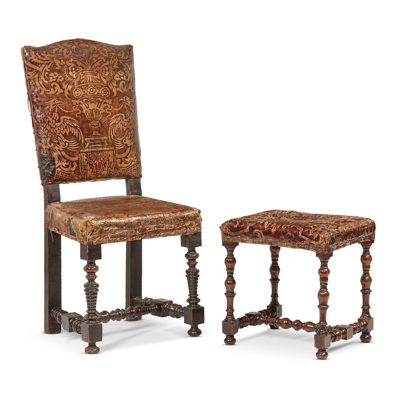 SEDIA E PANCHETTO, EMILIA, SECOLO XVII schienale e sedute rivestite in cuoio impresso a motivo di vaso con fiori e due aquile, sostegni posteriori diritti, quelli anteriori a rocchetto riuniti da traverse ad H analogamente tornite, piedi a cipolla; cm 113x51x50 e cm 47x47x38