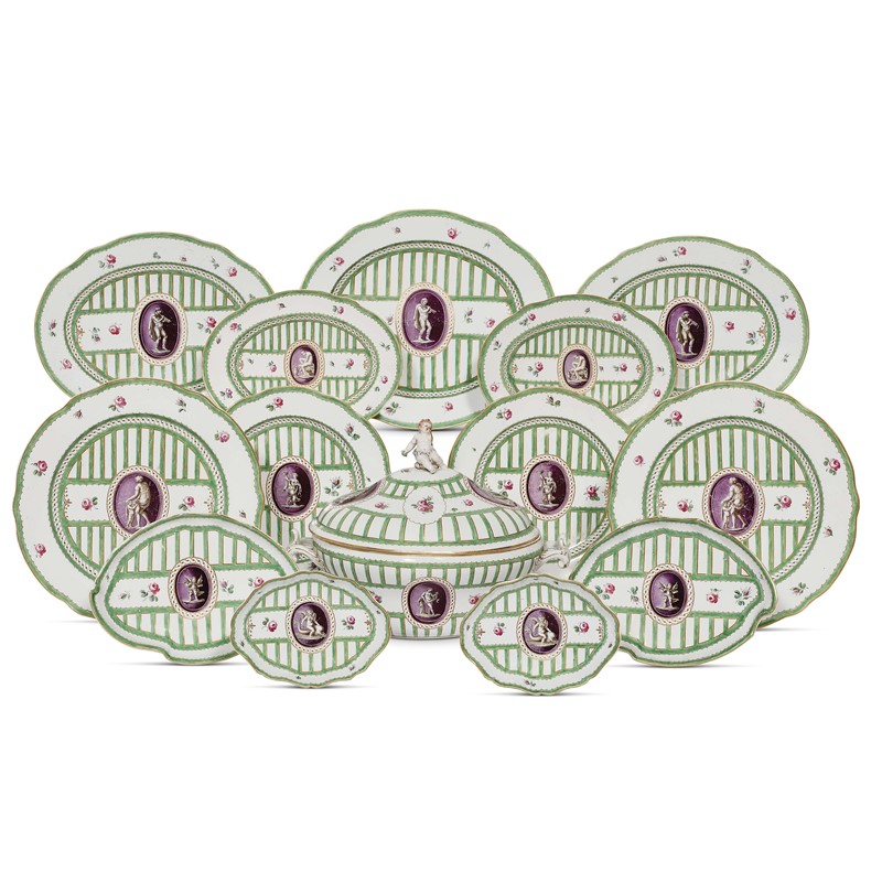 composto da quattordici pezzi in porcellana dipinta in policromia e oro secondo il tipico decoro “a cammeo” con fasce verdi e roselline. La decorazione si sviluppa intorno ad un cammeo centrale entro cornice costituita da un nastro intrecciato inserito al centro di un’ampia riserva orizzontale, posta a sua volta posta su un decoro formato da fasce parallele verticali verdi su fondo bianco. Composizione: zuppiera con presentatoio, 4 vassoi ovali (due lungh. cm 33,5, due cm 26,8), 4 vassoi circolari (due diam. cm 26,4, duecm 30,2), 2 vassoietti sagomati (lungh. cm 17,8), 2 marescialle (lungh. cm 24,5)
