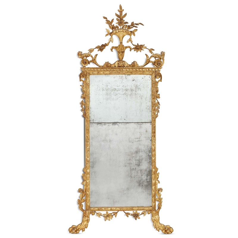 SPECCHIERA, TOSCANA, METÀ SECOLO XVIII in legno intagliato e dorato, presenta cimasa lavorata a giorno con vaso di fiori dal quale si dipartono tralci fioriti che ricadono sugli angoli e scendono poi sui fianchi desinenti in zampe ferine impreziosite da racemi fioriti che si congiungono ad adornare la pendaglina, battuta lavorata a fogliette lanceolate fermate ai centri da nastrini; cm 208x98