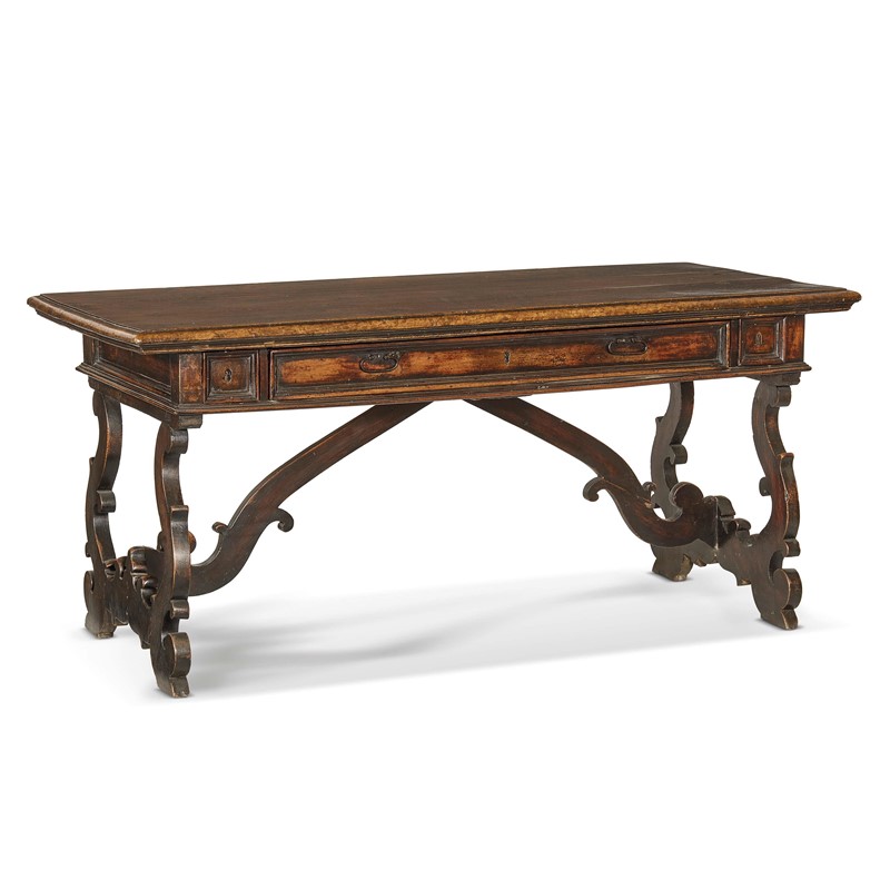 TAVOLO SCRITTOIO, TOSCANA, FINE SECOLO XVII in noce, il piano aggettante terminante a becco di civetta sotteso da fascia presentante sul fronte lungo cassetto con maniglie circolari affiancato da due piccoli cassetti con serratura a scomparsa e sugli altri lati cartelle presentanti piccole modanature, gambe a lira con traverse analogamente intagliate; 82,5x177,5x82