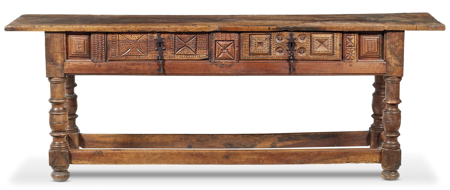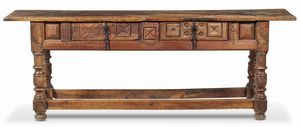 in noce, piano di forma rettangolare sotteso da fascia sulla quale si aprono due cassetti appaiati ornati da intagli a motivi geometrici e intervallati al centro e ai lati da sformellature geometriche, maniglie e bocchette in ferro battuto, fianchi sformellati da cornice modanata, retro intagliato a motivi geometrici alternati entro riserve quadrate e rettangolari, gambe a rocchetto riunite da traverse diritte; cm 85,5x58,5x236