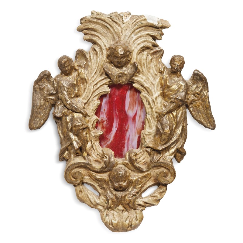 TRE CORNICI, ITALIA MERIDIONALE, SECOLO XVIII in legno intagliato, laccato e dorato, vetro colorato di forma circolare racchiuso entro intaglio di cherubini ai centri superiore ed inferiore ed impreziosito da motivi fogliacei ed angeli ad ali spiegate ai lati; cm 51x44