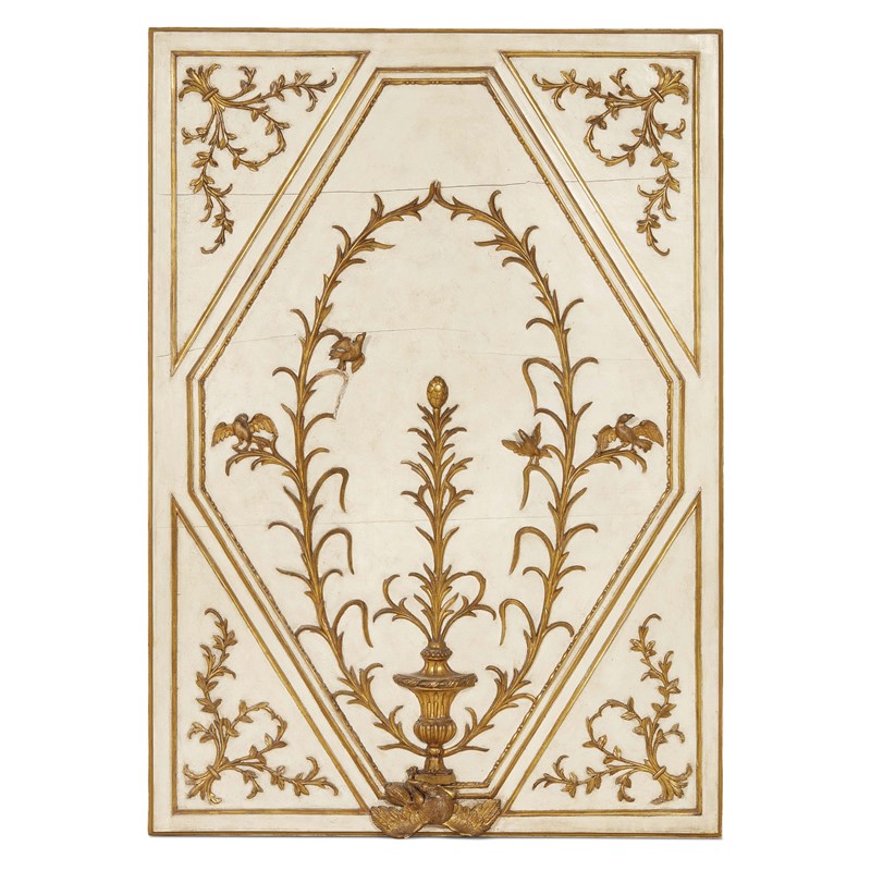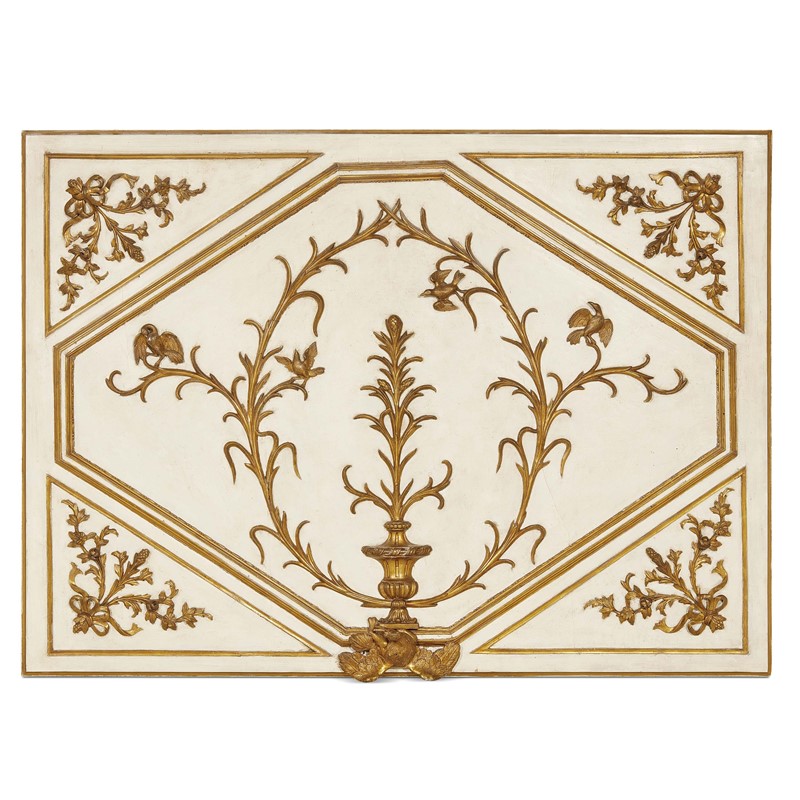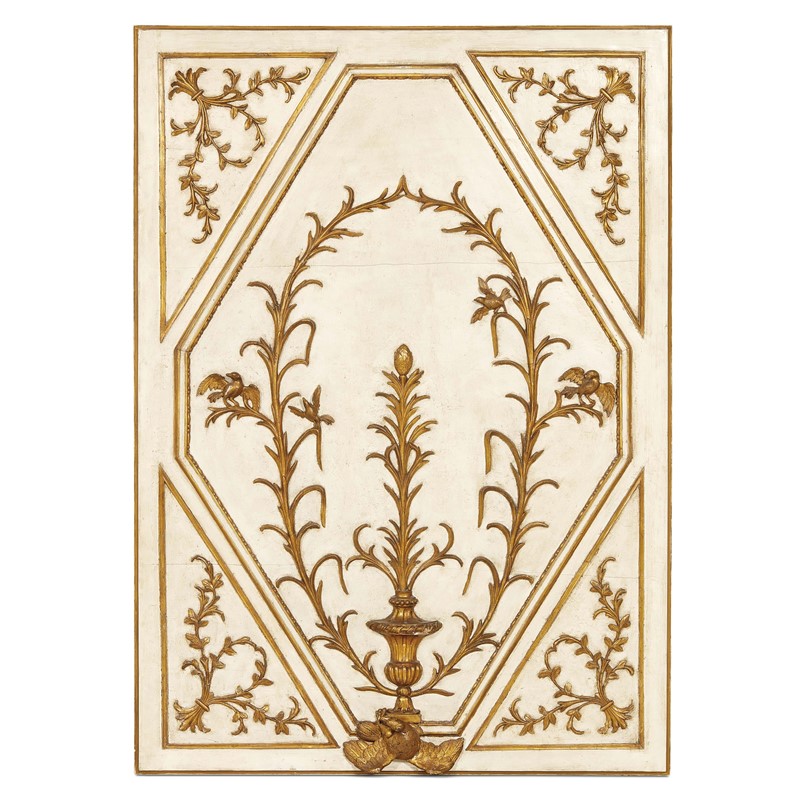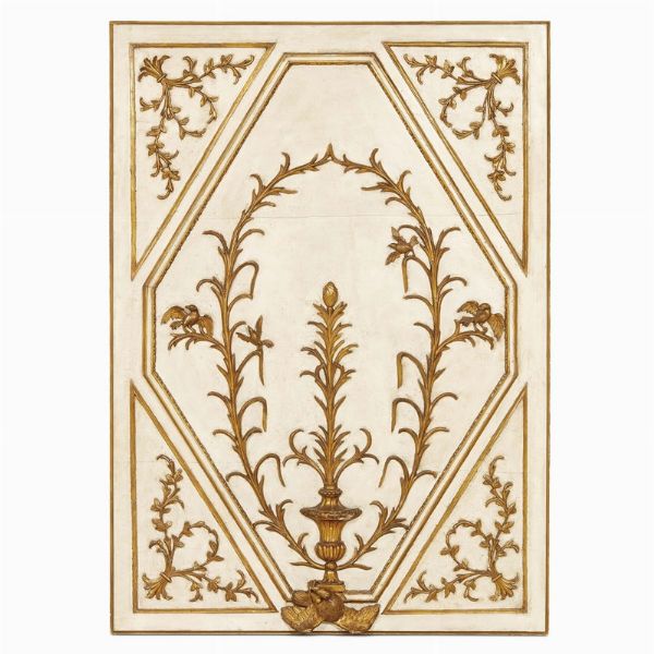 TRE ELEMENTI DI BOISERIE, PIEMONTE, PERIODO LUIGI XVI in legno laccato colore crema e dorato, a riserve geometriche che racchiudono racemi con uccelli che racchiudono balaustro da cui si diparte un ramo fogliaceo con finale a pigna; cm 102x140x12,5 e 144,5x102x12,5