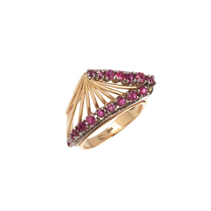 in oro giallo e bianco 18kt, realizzato con una punta a cuspide, impreziosito da una fila di rubini taglio rotondo per ct 0.80 circa, punzoni 750 e del fabbricante, mis.53, gr. 7