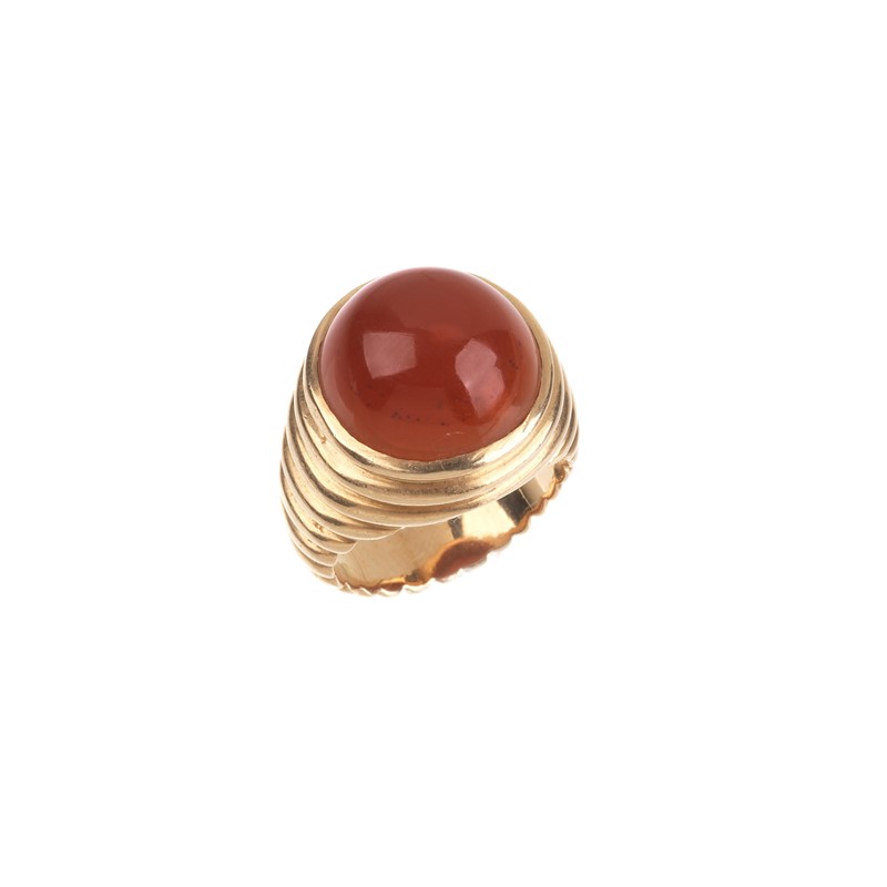 in oro giallo 18kt, con fascia scanalata ed una corniola taglio cabochon sulla sommità, mis. 48, gr. 12
