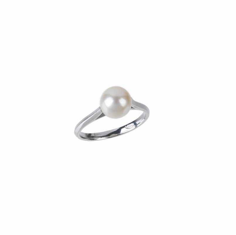 in oro bianco 18kt, recante sulla sommità una perla di mm 8 circa, punzoni 750 e del fabbricante, mis. 55, gr. 3