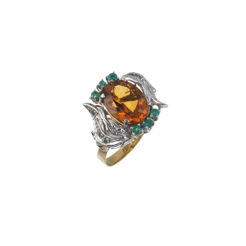 ANELLO CON QUARZO CITRINO DIAMANTI E SMERALDI in oro e argento, con al centro un quarzo citrino sfaccetto di ct 4 circa cinto da tralci impreziositi da diamanti taglio brillante e sei smeraldi taglio rotondo per ct 0.20 circa, punzoni 750, 925 e del fabbricante, mis. 55, gr. 6