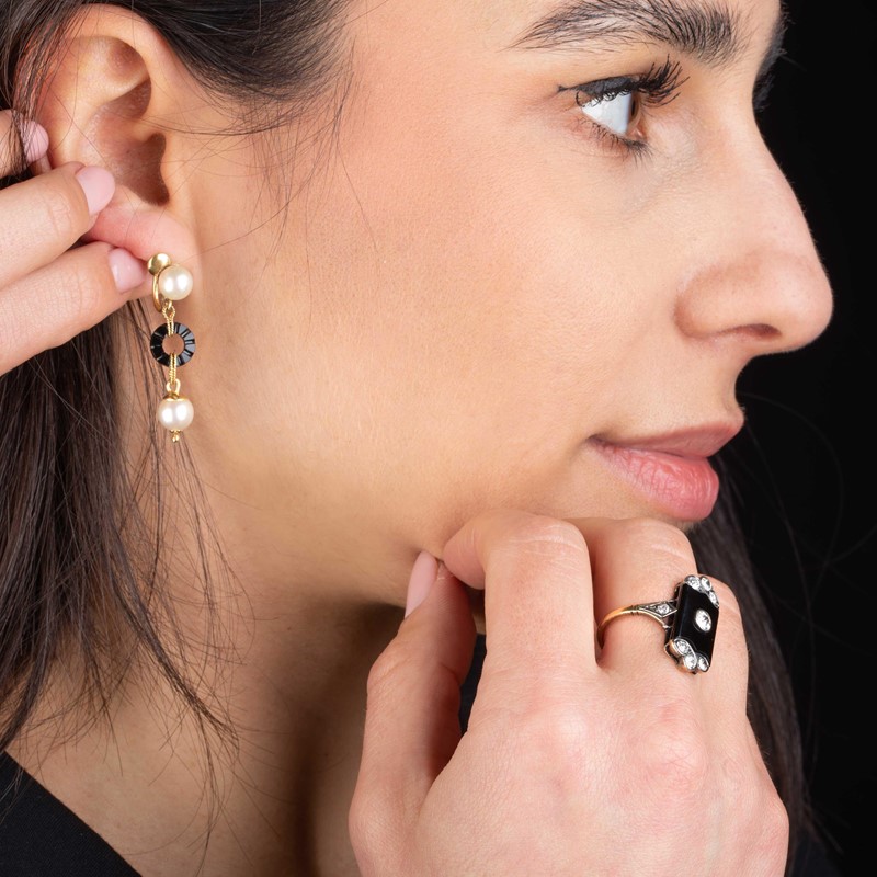 anello in oro e argento, parzialmente decorato in onice e diamanti taglio vecchio per ct 0.70 circa, punzone 750, mis. 57, gr. 4, accompagnato da un paio di orecchini pendenti, impreziositi da perle di mm 6 circa e dischi in onice, chiusura a vite, dim. cm 1x3 circa, gr. 5 complessivi