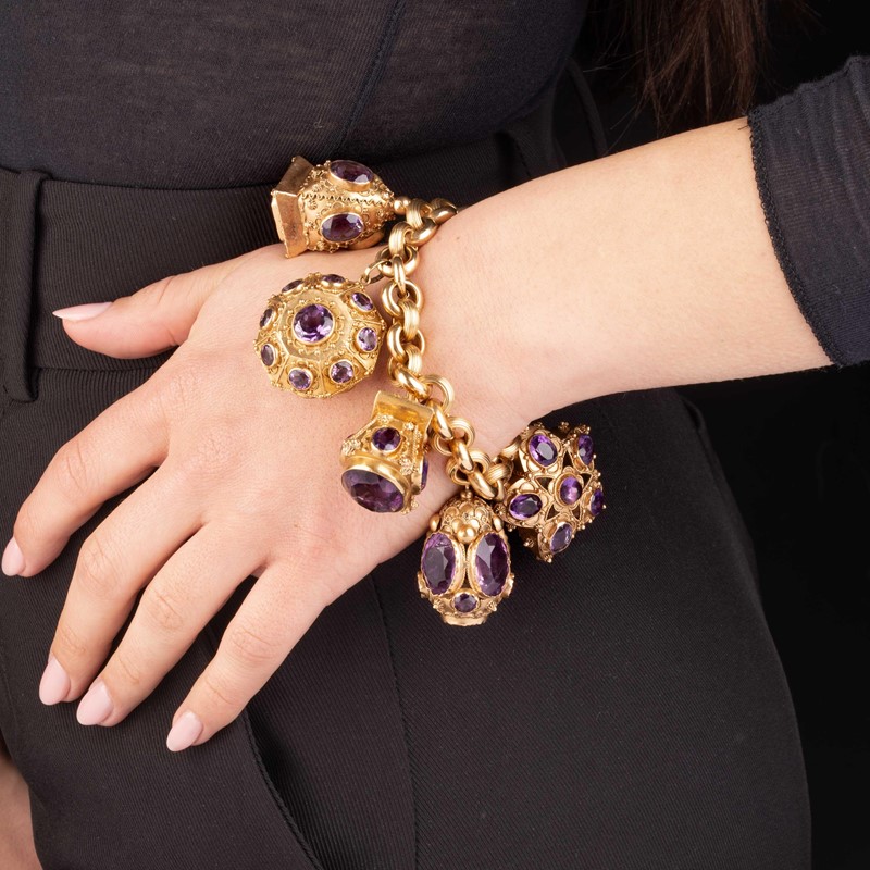 BRACCIALE A CATENA CON CHARMS in oro giallo 18kt, composto da una catena a maglia rollò da cui pendono sei grandi ciondoli di varie forme, lavorati in filigrana e impreziositi da ametiste taglio fantasia, chiusura a moschettone, punzone 750, lungh. cm 19, gr. 140