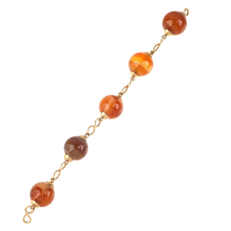 in oro giallo 18kt, con maglie a forma di infinito alternate a grandi sfere in corniola di mm 19 circa, punzoni 750 e del fabbricante, lungh. cm 22, gr. 72
