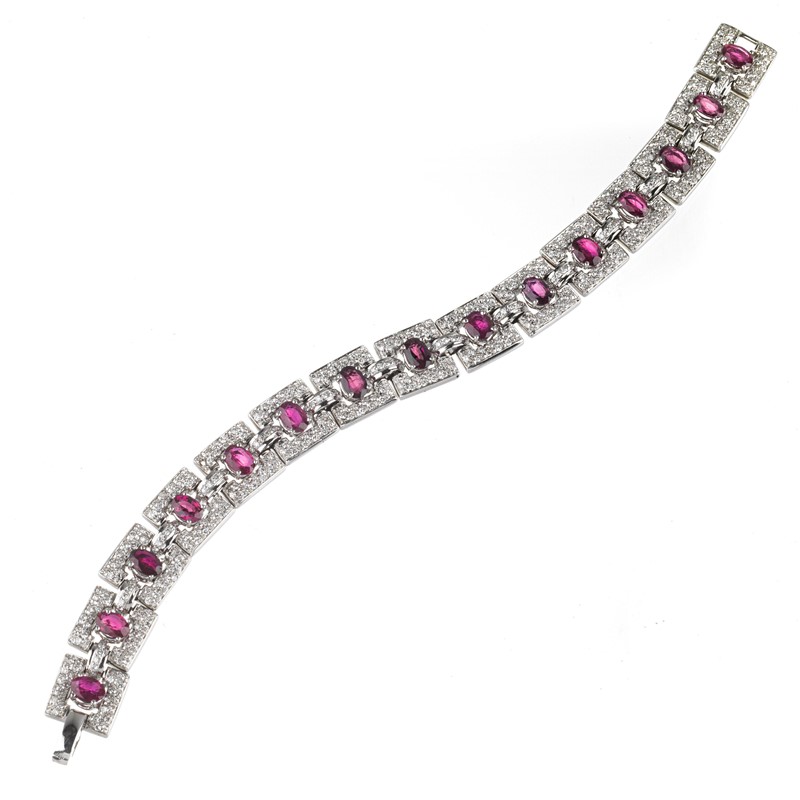BRACCIALE A CATENA CON ZAFFIRI ROSA E DIAMANTI in oro bianco 18kt, composto da una serie di maglie quadrate concatenate e impreziosite da diamanti taglio brillante (uno mancante) per ct 4 circa, recanti al centro rubini taglio ovale per ct 7.50 circa, punzone 750, lungh. cm 18,5, gr. 47