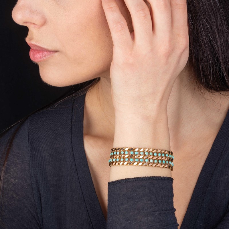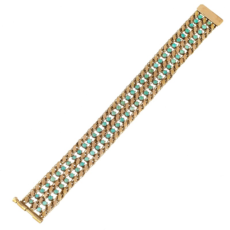 in oro 14kt, realizzato a maglia tessita, con una doppia fila di turchesi taglio cabochon, lungh. cm 17, gr. 20