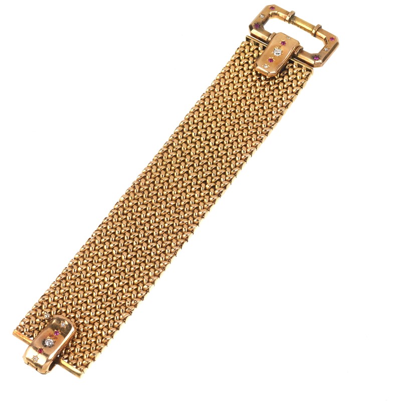 BRACCIALE A FORMA DI CINTURA in oro giallo 18kt, realizzato a maglia tessita, chiusura a forma di fibbia impreziosita da diamanti taglio vecchio per ct 0.50 circa e piccoli rubini sintetici taglio rotondo, punzoni 750 e del fabbricante, lungh. cm 19, gr. 105