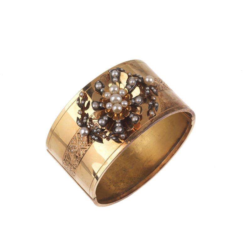 in oro e argento, impreziosito al centro da un motivo floreale con perle e microperle, decorato al centro da un fregio traforato, dim. cm 3x6 circa, diam. interno cm 5,5, gr. 39