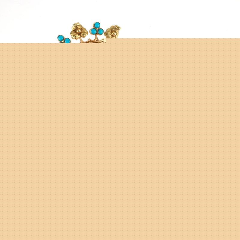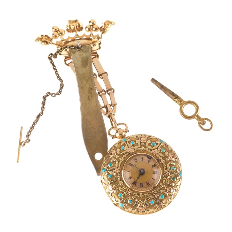CHONIFSEN A PARIS OROLOGIO DA TASCA cassa a cerniera in oro giallo 18kt decorata finemente con motivi floreali, fogliacei e turchesi, quadrante oro con foro per la carica, numeri romani in nero, movimento a carica manuale, vetro plastica, gr. 80. Diam. mm 41. Corredato di gancio da cintura in oro a basso titolo con parte posteriore in metallo, sormontato da corona decorata con fiori e turchesi. Corredato di chiave di carica.