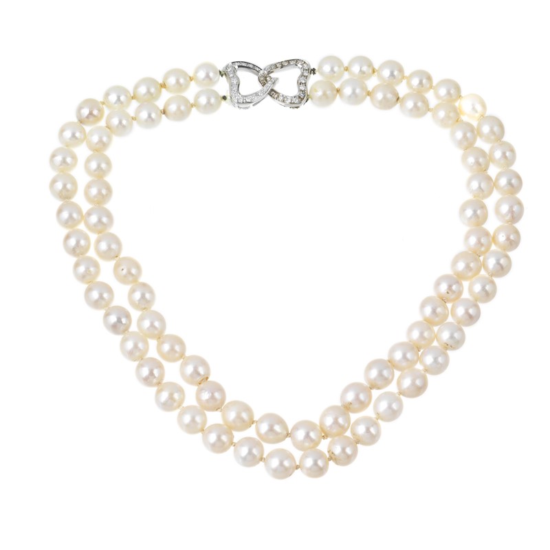 a doppio filo di perle di mm 9 circa, fermatura in oro bianco 18kt impreziosita da diamanti taglio huit huit per ct 0.70 circa, lungh. cm 40, gr. 91