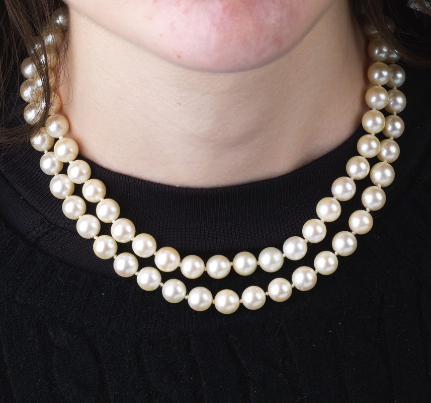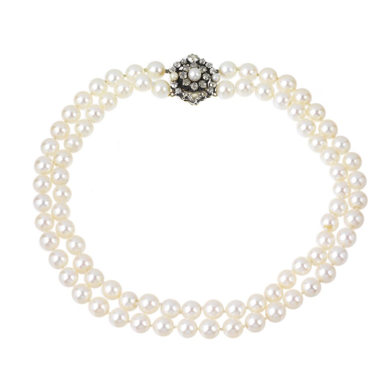 COLLANA DI PERLE composta da un doppio filo di perle di mm 8 circa, fermatura in oro e argento a forma di fiore, impreziosita da una perla centrale di mm 5 circa e circondata da diamanti taglio vecchio e a rosa per ct 2.80 circa, punzone 750, lungh. cm 38, gr. 86