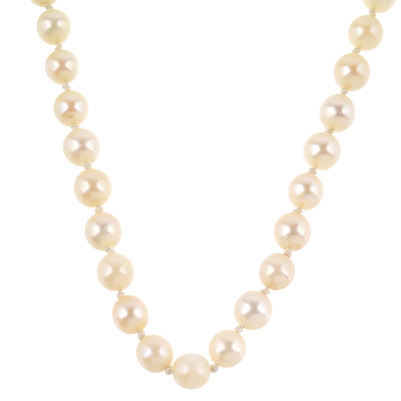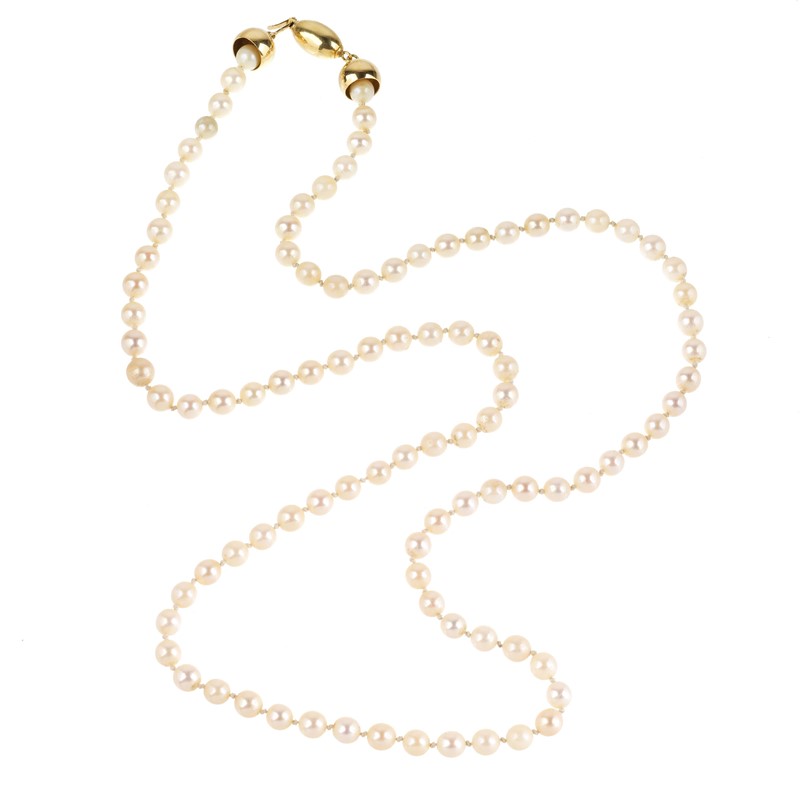 ad un filo di perle di mm 6 circa, fermatura in oro giallo 18kt, punzone 750, lungh. cm 87, gr. 55