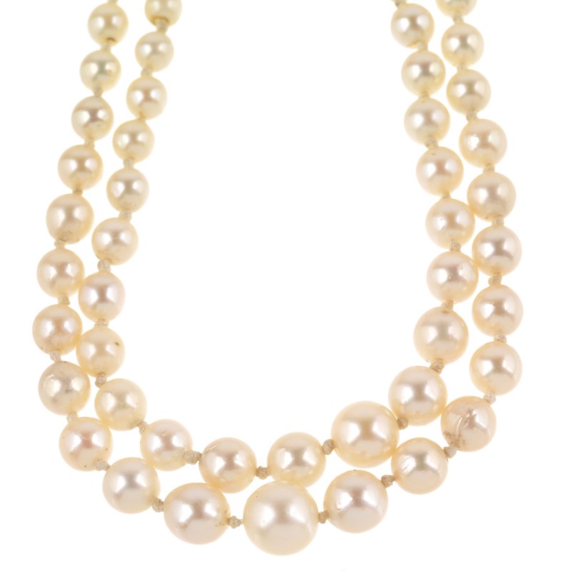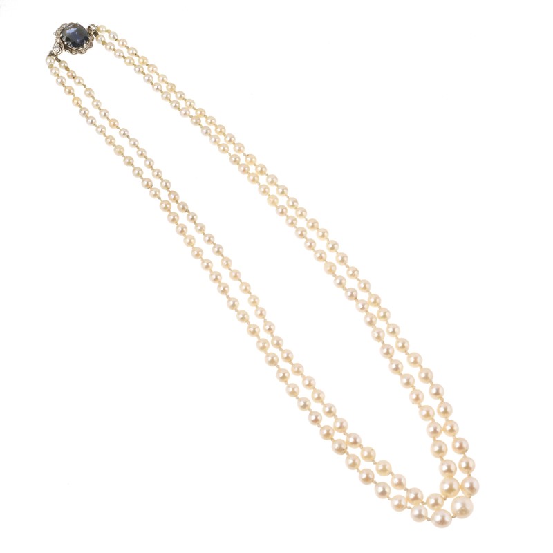 COLLANA DI PERLE composta da un doppio filo di perle digradanti di mm 8-3 circa, fermatura di forma floreale impreziosita al centro da uno zaffiro taglio rotondo di ct 1.30 circa circondato da una fila di diamanti taglio huit huit e brillante per ct 0.20 circa, punzone 750, lungh. cm 48, gr. 33