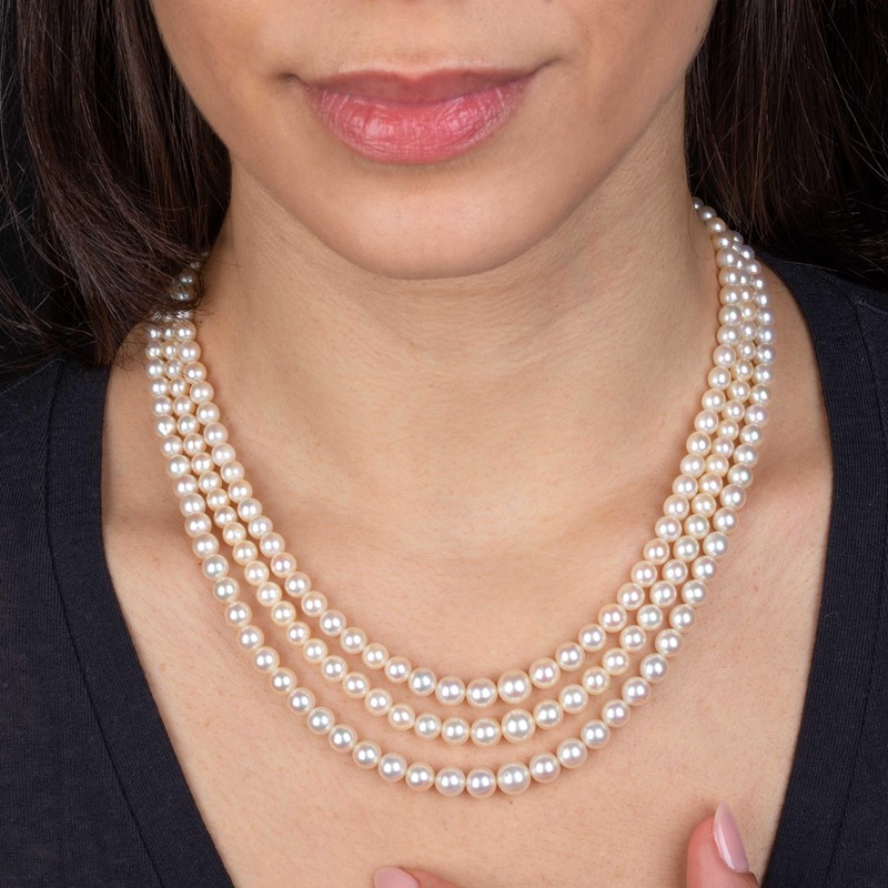 composta da tre fili di perle digradanti di mm 8-4 circa, fermatura in oro bianco 18kt con motivo floreale impreziosito da diamanti taglio huit huit per ct 0.40 circa, punzone 750, lungh. cm 44, gr. 64