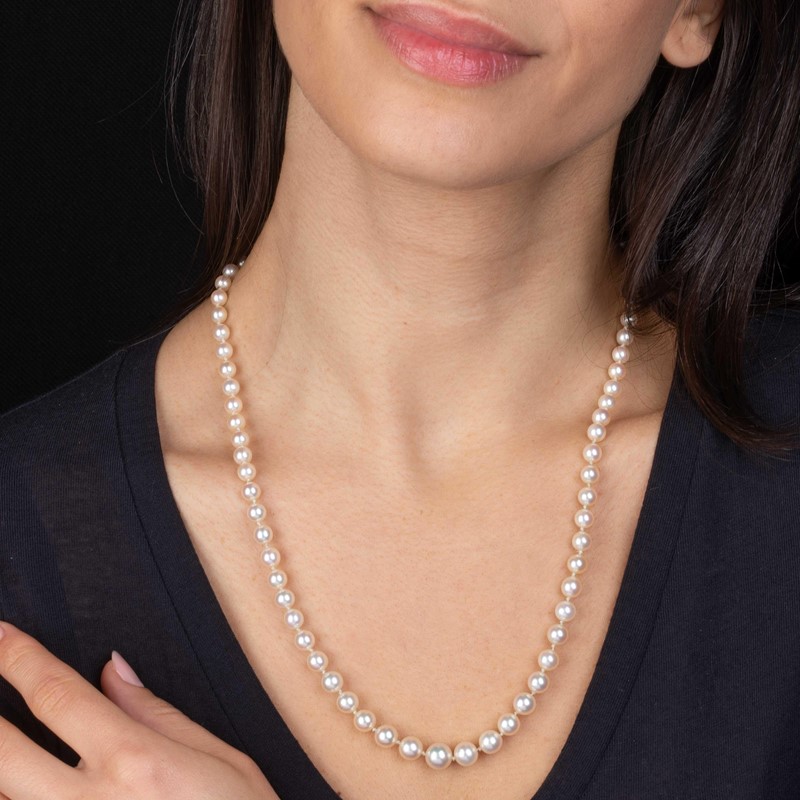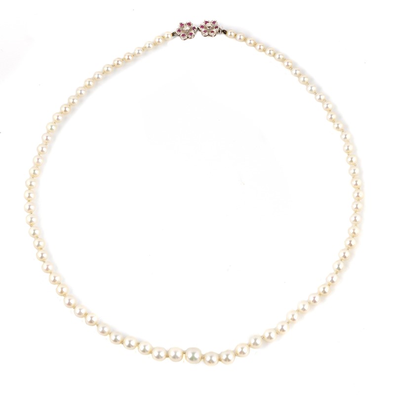 composta da un filo di perle digradanti di mm 8-5 circa, fermatura in oro bianco 18kt a forma di fiori impreziositi da rubini taglio rotondo e rose di diamante, lungh. cm 57, gr. 30