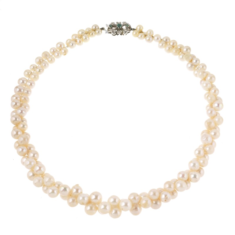 ad un filo perle agglomerate digradanti di mm 7-5 circa, fermatura in oro bianco 18kt impreziosita da tre piccoli smeraldi taglio rotondo, punzone 750, lungh. cm 40, gr. 57