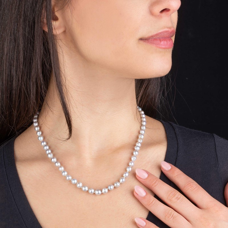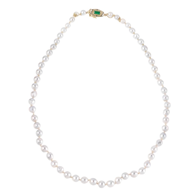 ad un filo di perle digradanti di mm 6-5 circa, fermatura in oro giallo e bianco 18kt con pietra sintetica verde, punzone 750, lungh. cm 45, gr. 24