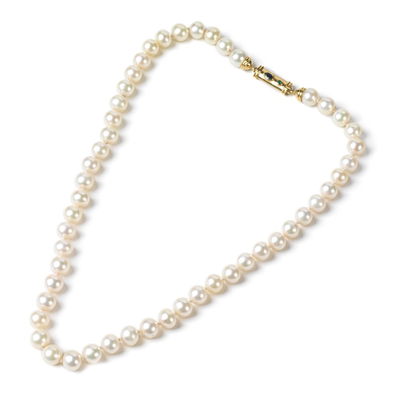 composta da un filo di perle di mm 8 circa, fermatura in oro giallo e bianco 18kt impreziosita da un rubino, uno zaffiro e due smeraldi, punzoni 750 e del fabbricante, lungh. cm 47,5, gr. 47